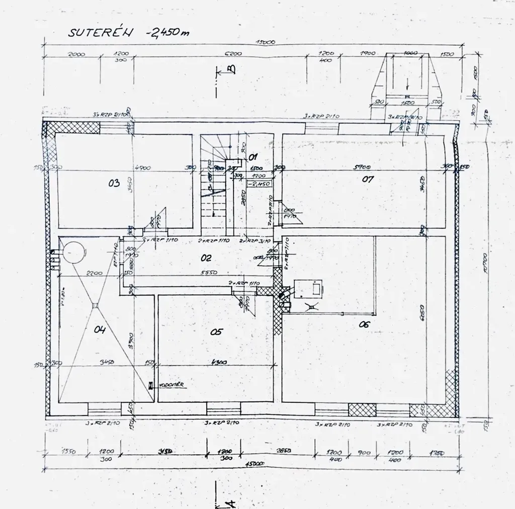 technické a skladové prostory pod částí domu (schodiště, chodba, 2x sklep, kotelna, prádelna, dílna)