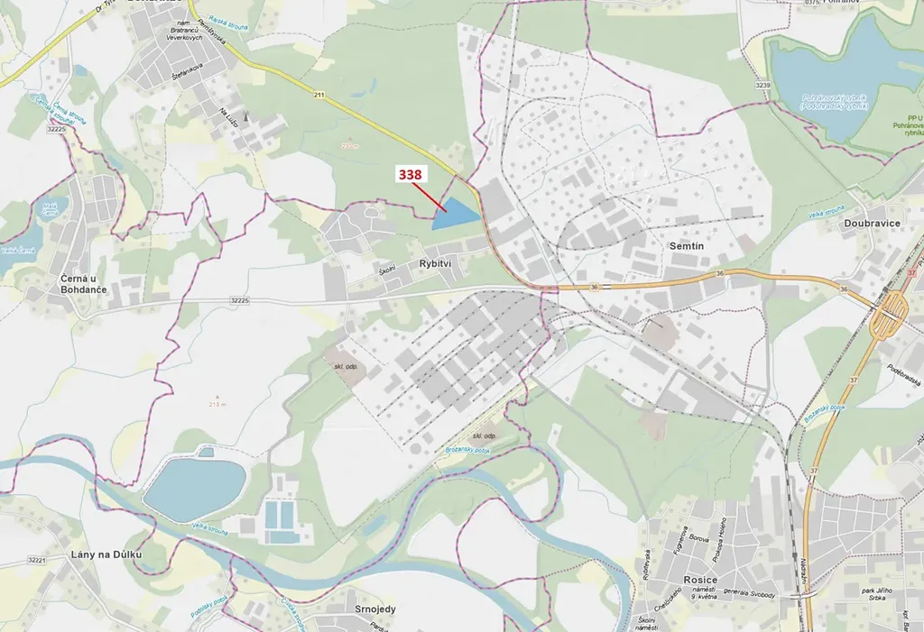 Lesní pozemek o výměře 37 060 m2, parcelní číslo 338, podíl 1/1, katastrální území Rybitví, obec Rybitví, obec s rozšířenou působností Pardubice, okres Pardubice, Pardubický kraj. Částečně po těžbě.