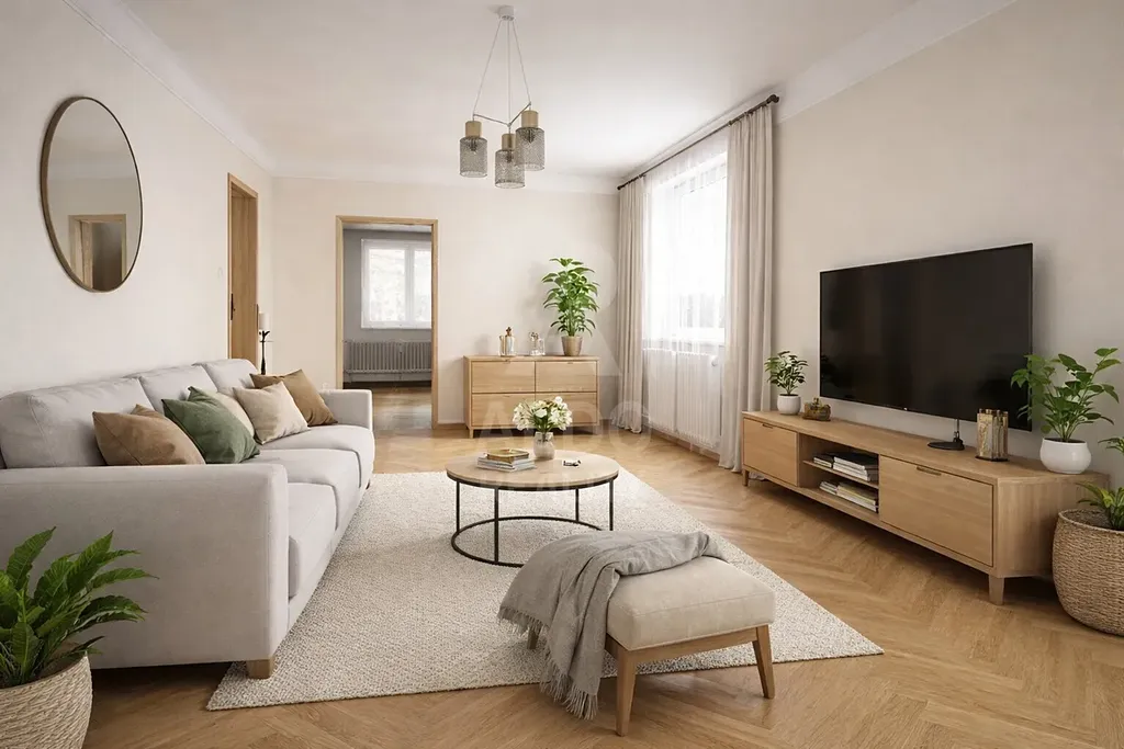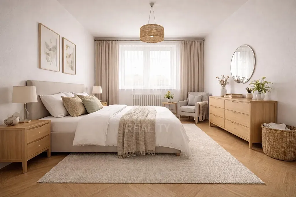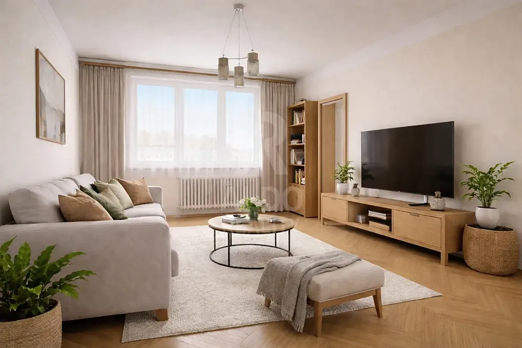 Dispozičně nabízí vstupní předsíň s komorou/šatnou, slunný obývací pokoj s okny na tři světové strany, pokoj samostatně přístupný z chodby a pokoj průchozí z obývacího pokoje s balkonem. Z chodby taktéž vstup do kuchyně, samostatného WC. Vchod do koupelny z kuchyně.
