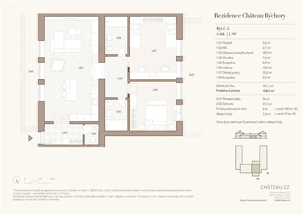 Byt č. 5 se nachází v přízemí jednopodlažního křídla (nad bytem pouze půda), má dispozici 3+kk a podlahovou plochu 108,5 m2. K bytu náleží sklepní kóje 7,6 m2 a parkovací stání, dále dvě předzahrádky ve výlučném užívání o velikostech 45,6 m2 (směrem do vnitřního nádvoří) a 13,6 m2.
