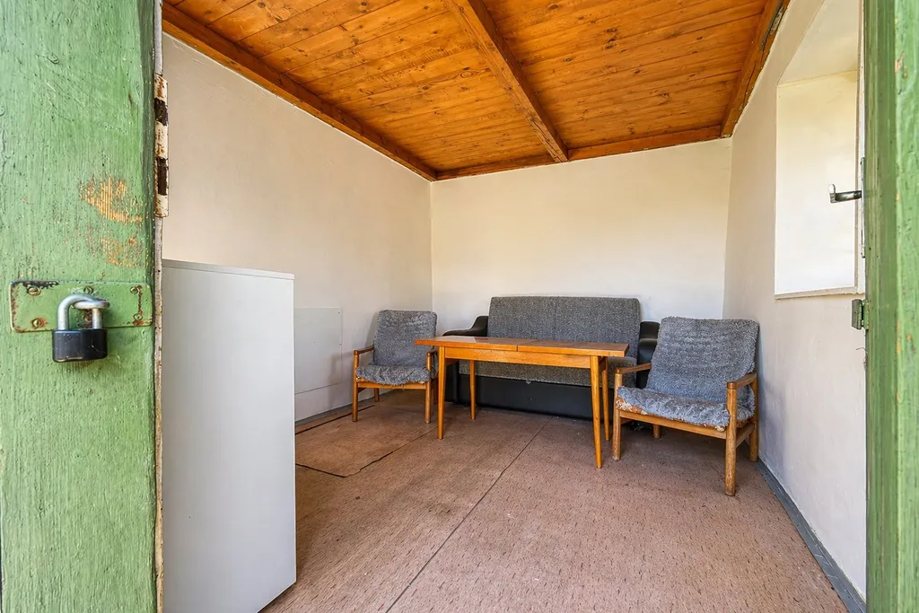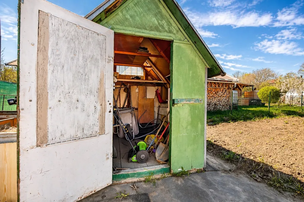 Na zahradě zůstává také vybavení v chatce i v kůlně, takže nový uživatel může zahradu bez větších investic rovnou začít využívat.