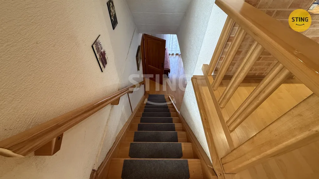 V prvním patře jsou 3 pokoje a kuchyňský kout, druhá koupelna.