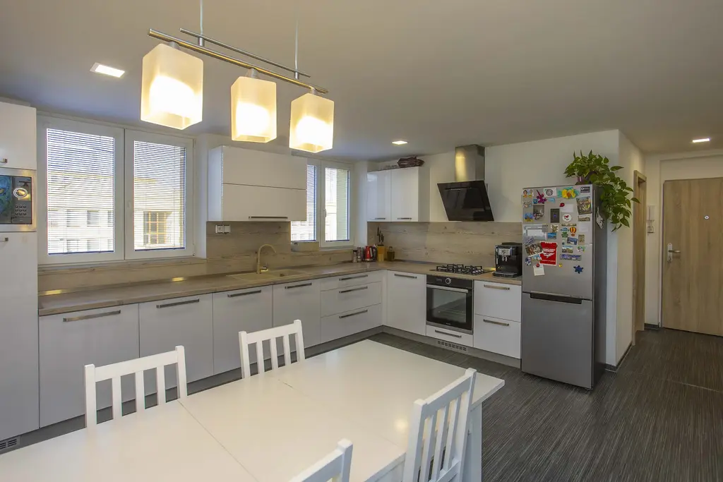 Dominantou celého bytu je velkorysá kuchyně s jídelnou, která tvoří přirozené srdce domova: