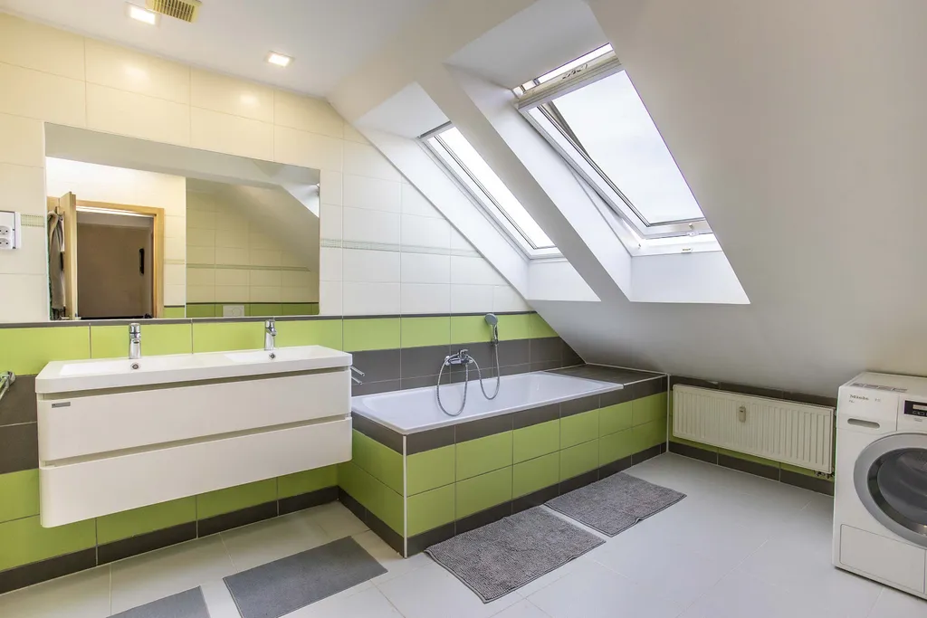 ✔️ velká koupelna s vanou, dvojumyvadlem a WC