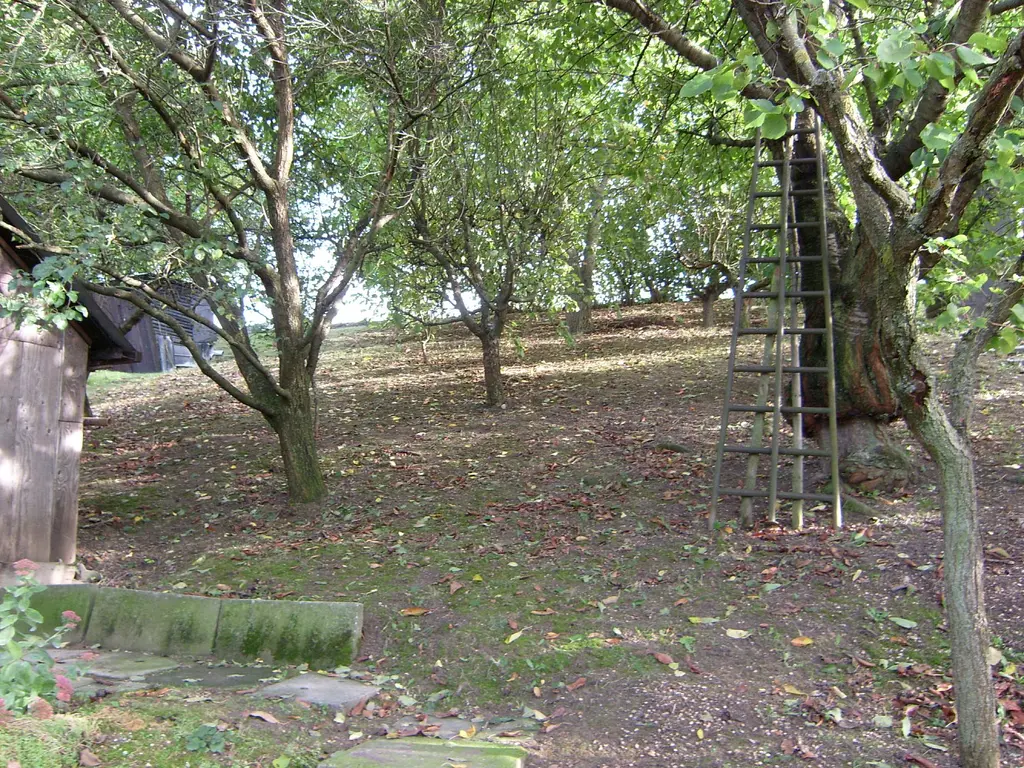 Zahrada je udržovaná, se vzrostlými okrasnými a ovocnými stromy, a příjezd automobilem je možný až na pozemek.