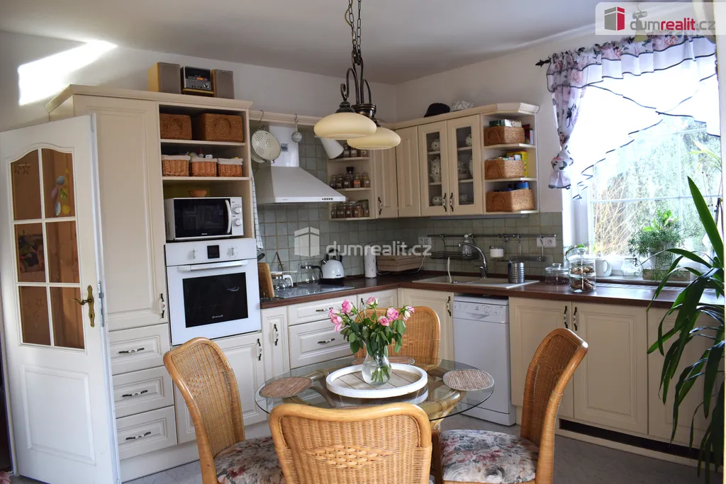 Přízemi - vstupní chodba na kterou navazuje velice hezká, prostorná kuchyň, obývací pokoj, který je rozdělen na dvě části, na pracovní s výhledem do zahrady a odpočinkovou.