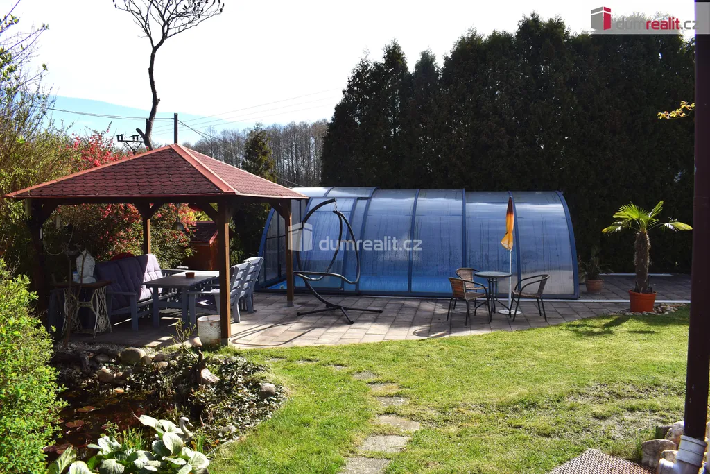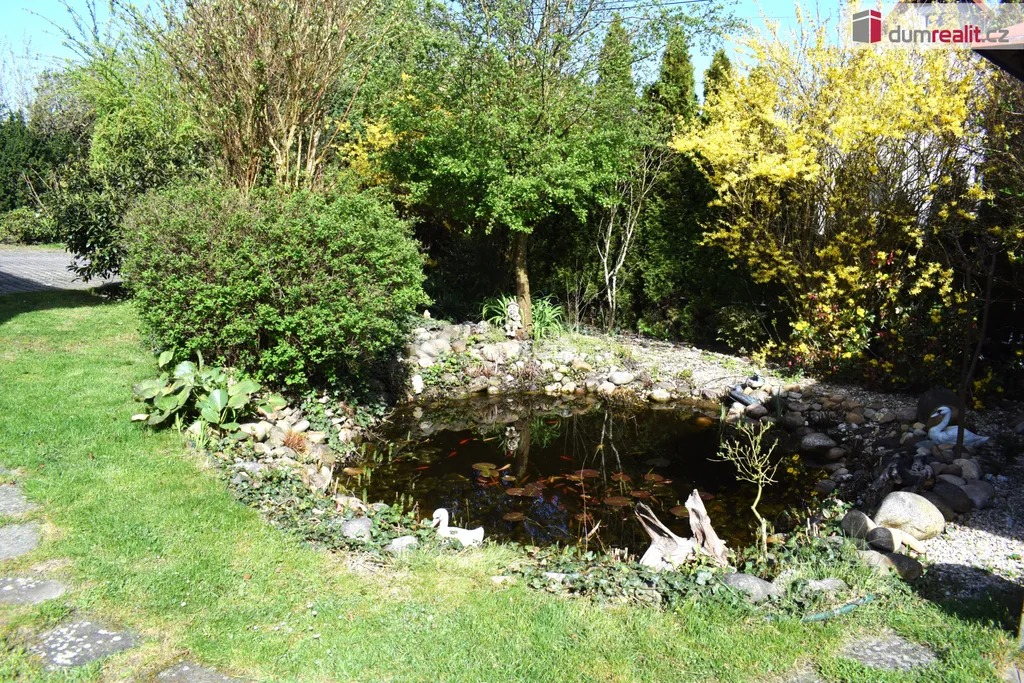 Zahrada je udržovaná - venkovní bazén, pergola, jezírko, dřevník, skleník, studna a přístřešek.
