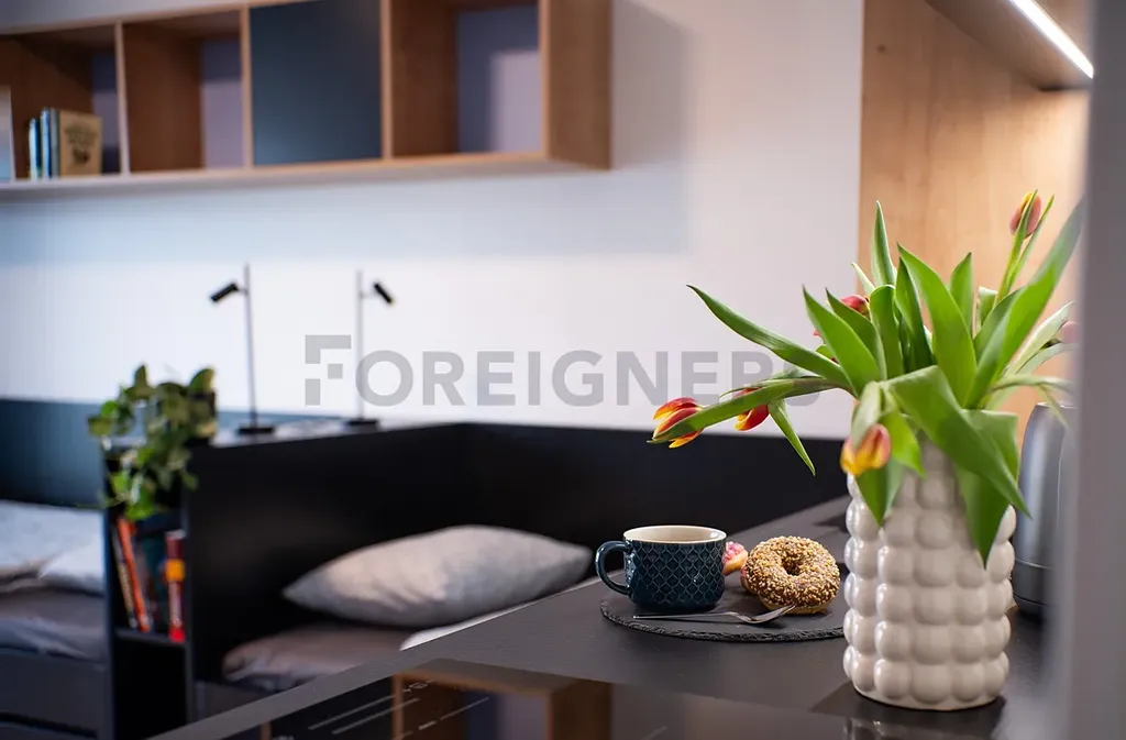 Studio dále zahrnuje 2 pracovní stoly s úložným boxem (vel. stolu 140 x 75 cm) + 2x židle; 2 jednolůžkové postele s úložným prostorem; 2 knihovny; 4 lampičky; magnetickou stěnu; 2 šatní skříně.
