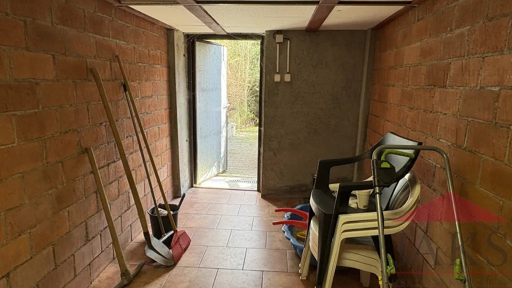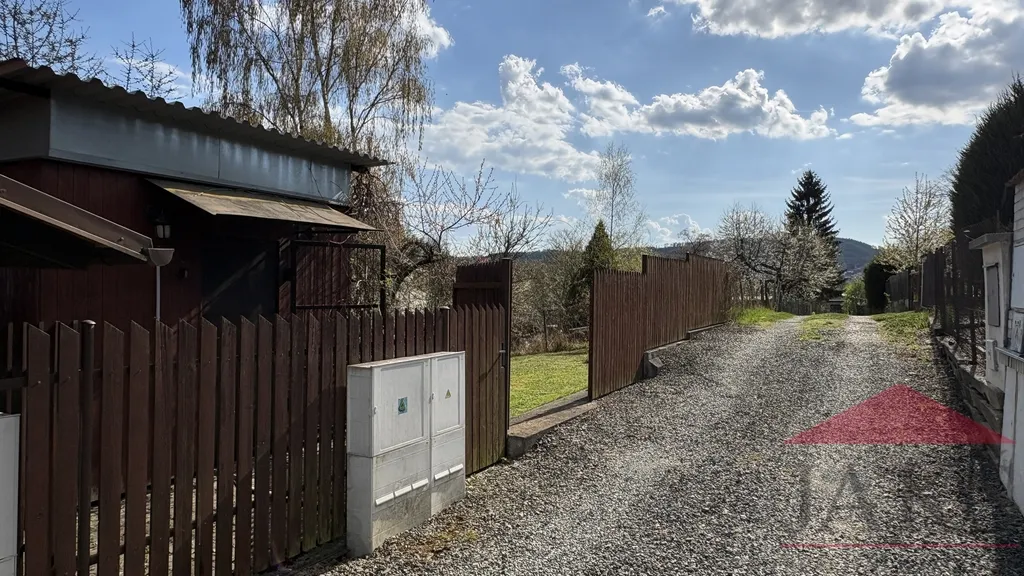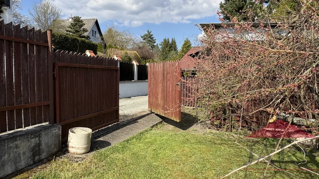 Popis: oplocený pozemek plný vzrostlých stromů (vzrostlé túje zaručující soukromí, třešeň, jabloně, bříza) s vjezdem a kompostem. Palubkami obložená a obydlená, částečně podsklepená (vinný sklep a sklad) stavební buňka (která nemusí být zapsaná v KN, podle vyjádření stavebního úřadu) s připojenou elektřinou a pokojem (palanda, stůl, skříň) ideální jako zázemí k zahradě či budoucí stavbě.