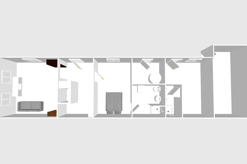 Dispozičně je dům řešen jako 2+1 a nabízí příjemný obytný prostor ideální pro jednotlivce, pár, rodinu nebo jako víkendové útočiště. Ze zádveří je vstup do malé chodby, která vede do obývacího pokoje. Ten je situován směrem do ulice. Navazuje na něj kuchyň a zádveří vede také do ložnice. Za ložnicí je koupelna se sprchovým koutem, umyvadlem a pračkou. Další samostatný pokoj s vlastní koupelnou, je přístupný ze dvora, rozšiřuje možnosti využití – může sloužit jako pokoj pro hosty, pracovna nebo menší apartmán.