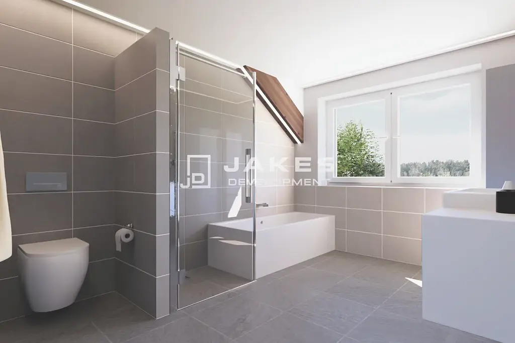 Dřevěné podlahy s podlahovým vytápěním – pro maximální komfort a příjemnou atmosféru domova. Koupelna s velkoformátovou dlažbou a moderními sprchovými podomítkovými bateriemi. Venkovní žaluzie – snadná regulace světla i soukromí. HS portál s trojsklem – zajišťuje špičkovou tepelnou izolaci a odhlučnění. Energetická náročnost budovy třídy B – nízké provozní náklady.