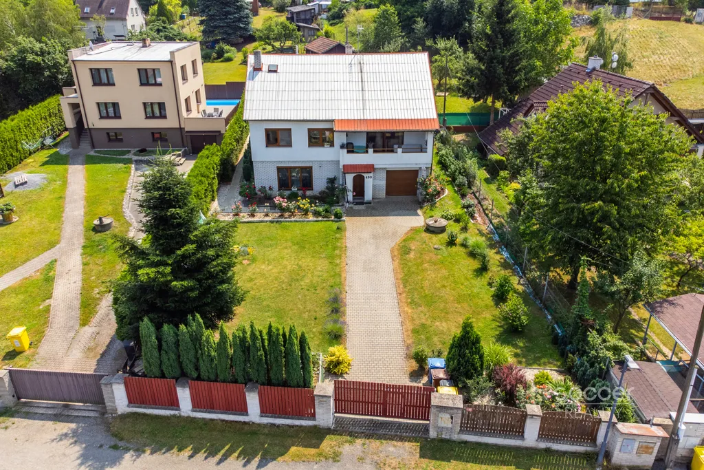 Dominantou domu je světlý obývací pokoj s krbovými kamny, která vytvářejí příjemnou atmosféru a zároveň efektivně vytápí prostor. Na obývací část navazuje jídelna a kuchyně s plně vybavenou kuchyňskou linkou. Z kuchyně je vstup na zahradu a terasu, ideální pro relaxaci nebo posezení s rodinou a přáteli. Dalším benefitem je krytá terasa s krásným výhledem do okolí.
