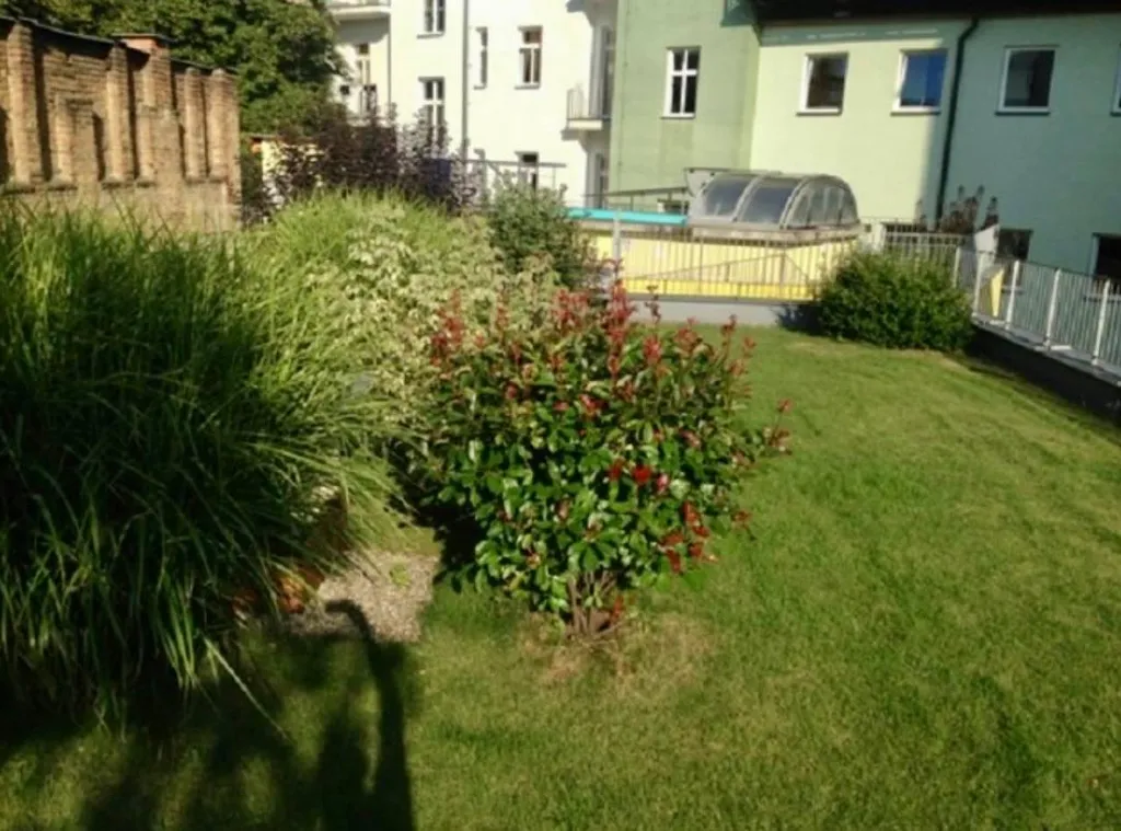 Velkou výhodou je možnost využívání společného bazénu a zelené střešní terasy, které jsou k dispozici obyvatelům domu během teplých měsíců.