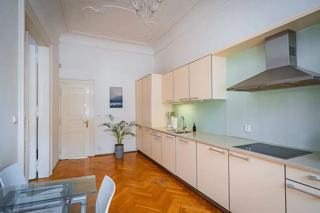 Tento výjimečný byt v sobě spojuje noblesu klasické architektury s komfortem moderního bydlení. Interiér bytu prošel pečlivou rekonstrukcí s důrazem na zachování původních řemeslných detailů, jako jsou vysoké stropy, dvojkřídlé kazetové dveře, původní dřevěné parkety a velkoformátová okna, která dodávají prostoru velkorysou vzdušnost a množství přirozeného světla.