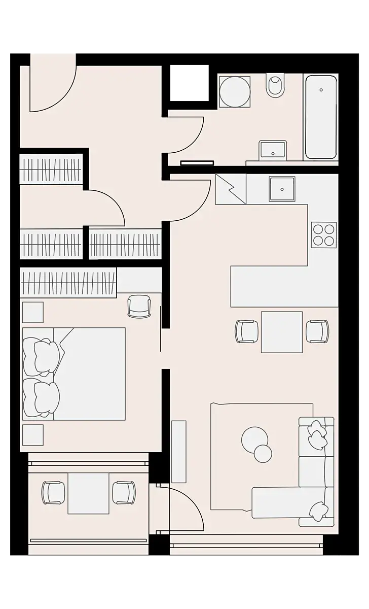 Byt o užitné ploše 49 m2 nabízí prostorný obývací prostor s kuchyňským koutem a oddělenou ložnici (šoupacími dveřmi). Další výhodou je balkón o ploše 3 m2, který poskytuje příjemný prostor k odpočinku či pěstování rostlin. Byt je jednopodlažní, což zajišťuje snadnou dostupnost všech jeho částí. V koupelně je v reálu vana se zástěnou.
