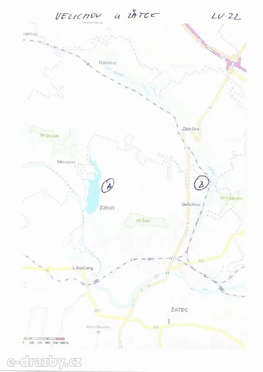 Předmětem dražby jsou pozemky nacházející se na různých místech katastru obce v místní části Velichov u Žatce a Záhoří.