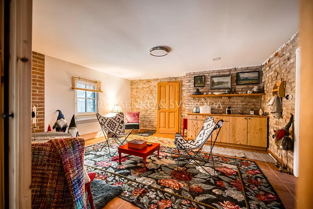 Zachované původní trámy, masivní dřevo, přirozené materiály, ruční detaily a světlo, které prostupuje každým koutem. Interiér je promyšlený do posledního detailu – propojuje historický charakter s komfortem moderního bydlení.