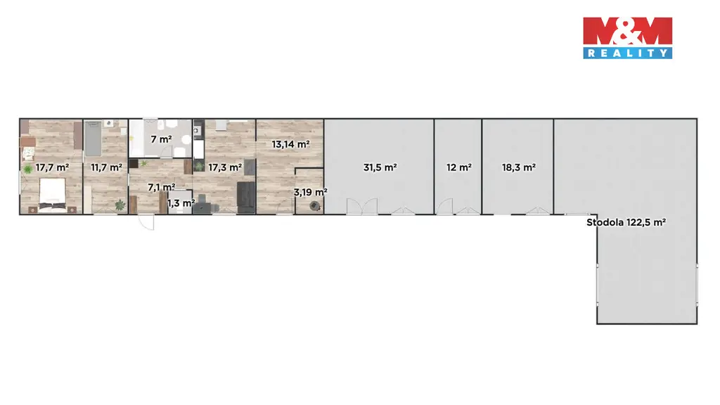 Na dům navazuje velká stodola, která nabízí široké možnosti využití, například pro spojení bydlení s podnikáním, dílnu nebo sklad.
