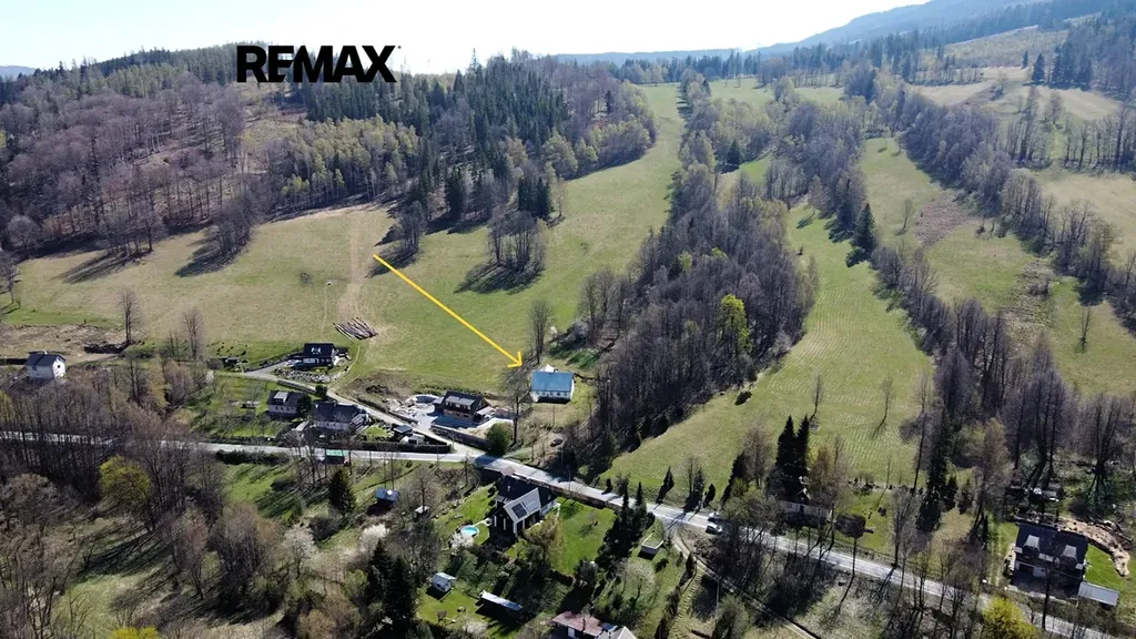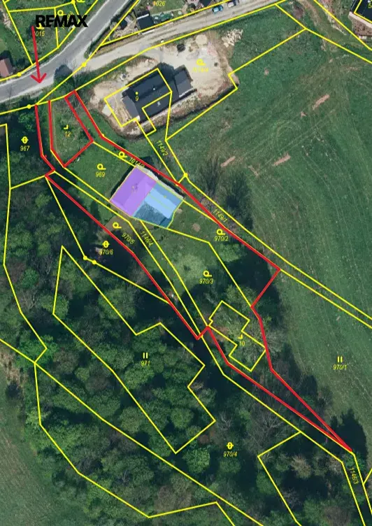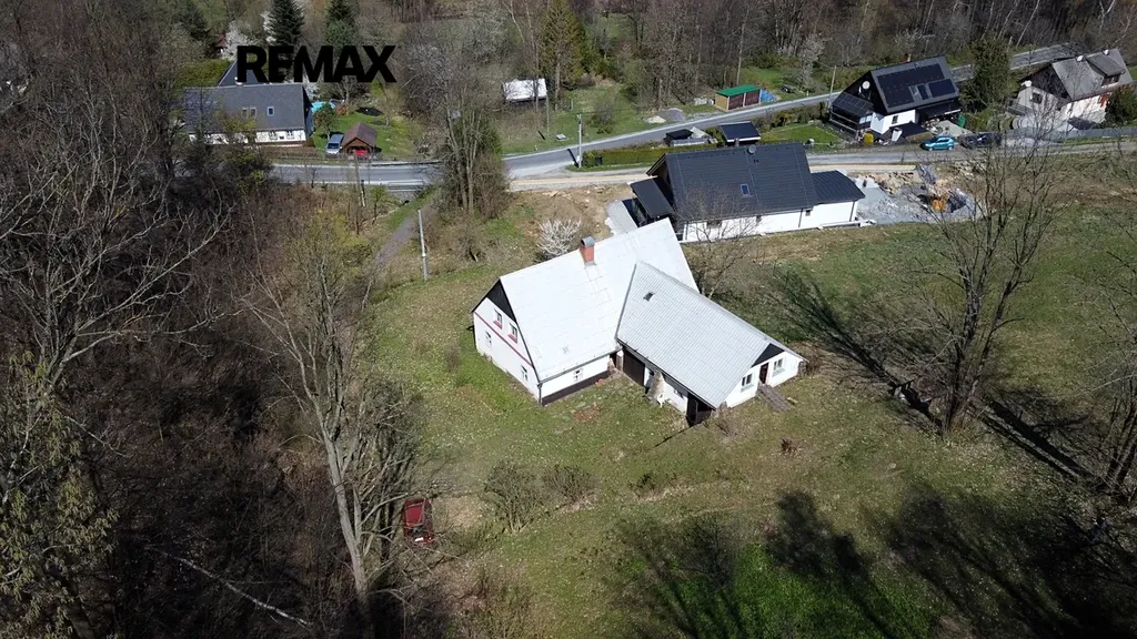 Dům je veden jako rodinný dům a stojí na svažitém pozemku o celkové výměře 3 117 m² s příjezdem až k nemovitosti.