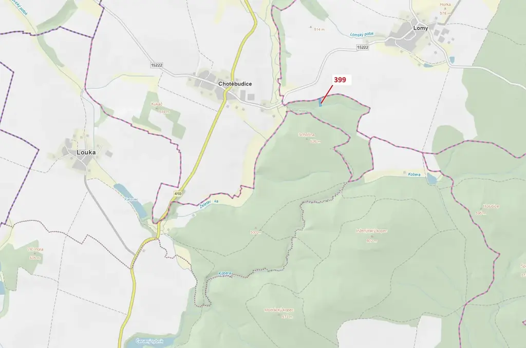 Lesní pozemek o výměře 2054 m2, parcelní číslo 399, podíl 1/1, katastrální území Chotěbudice, obec Chotěbudice, obec s rozšířenou působností Moravské Budějovice, okres Třebíč, Kraj Vysočina.