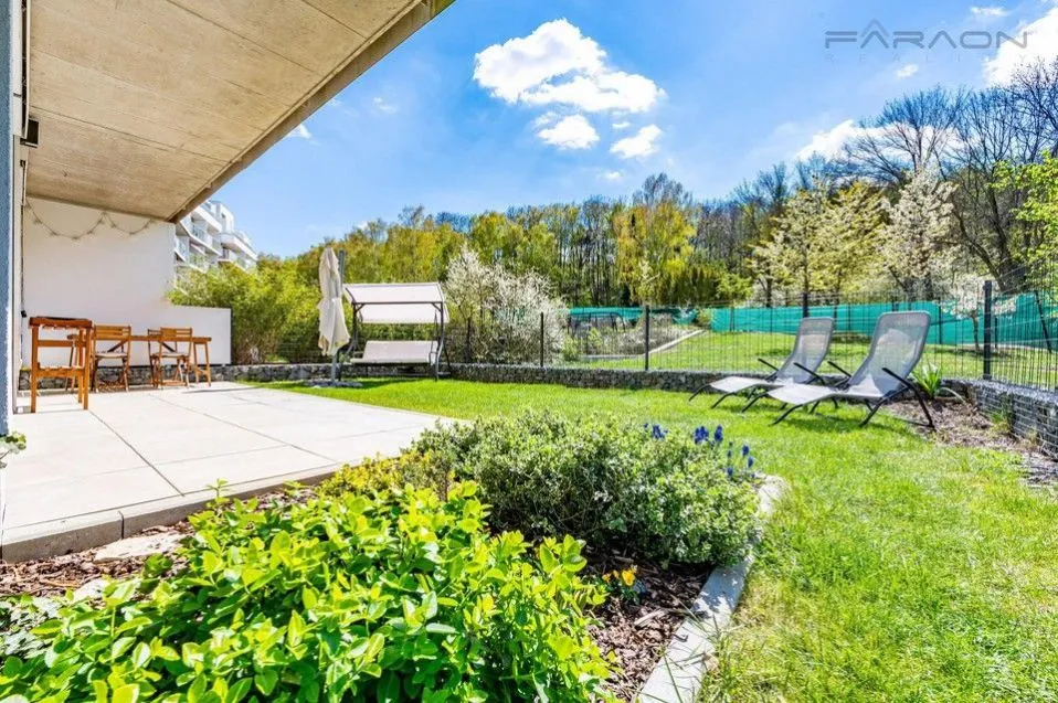 Byt má krajní, rohové umístění v rámci uzavřeného soukromého areálu a jeho jižní orientace, s výhledem k lesu, nabízí maximální soukromí. Na předzahrádku s terasou a praktickým zahradním domkem je možné vstoupit z obou pokojů. Bezparapetová, velkoformátová okna s výhledem do zeleně dodávají bytu úžasnou zenovou atmosféru.