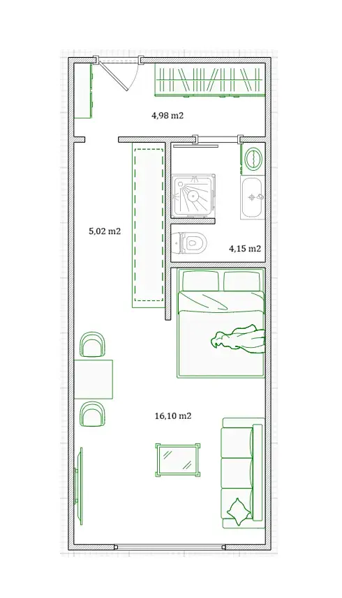 Z chodby se můžeme vydat dvěma cestami - první vede do kompletně zrekonstruované koupelny (r. 2022) se zděným jádrem, sprchovým koutem, toaletou a místem na pračku. Druhá cesta vede kuchyní, která byla součástí téže rekonstrukce a pokračuje do obytného prostoru, který má příčkou lehce vymezen prostor na postel a otevírá se do obývacího pokoje.
