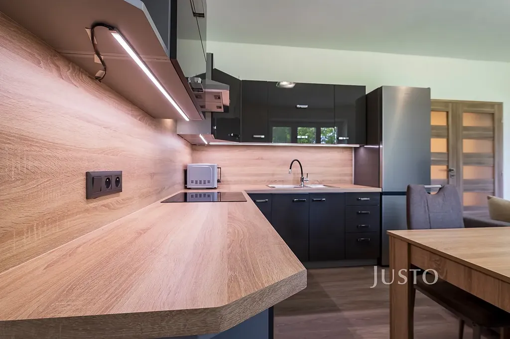 Kuchyně: Kuchyňská linka s vestavěnými elektrospotřebiči značky Gorenje (indukční varná deska, elektrická trouba a digestoř), mikrovlnná trouba značky Beko a lednice s mrazákem značky Gorenje. V kuchyni je také jídelní stůl, dvě židle, sedací souprava, konferenční stolek, stolek pod televizí a televize JVC.
