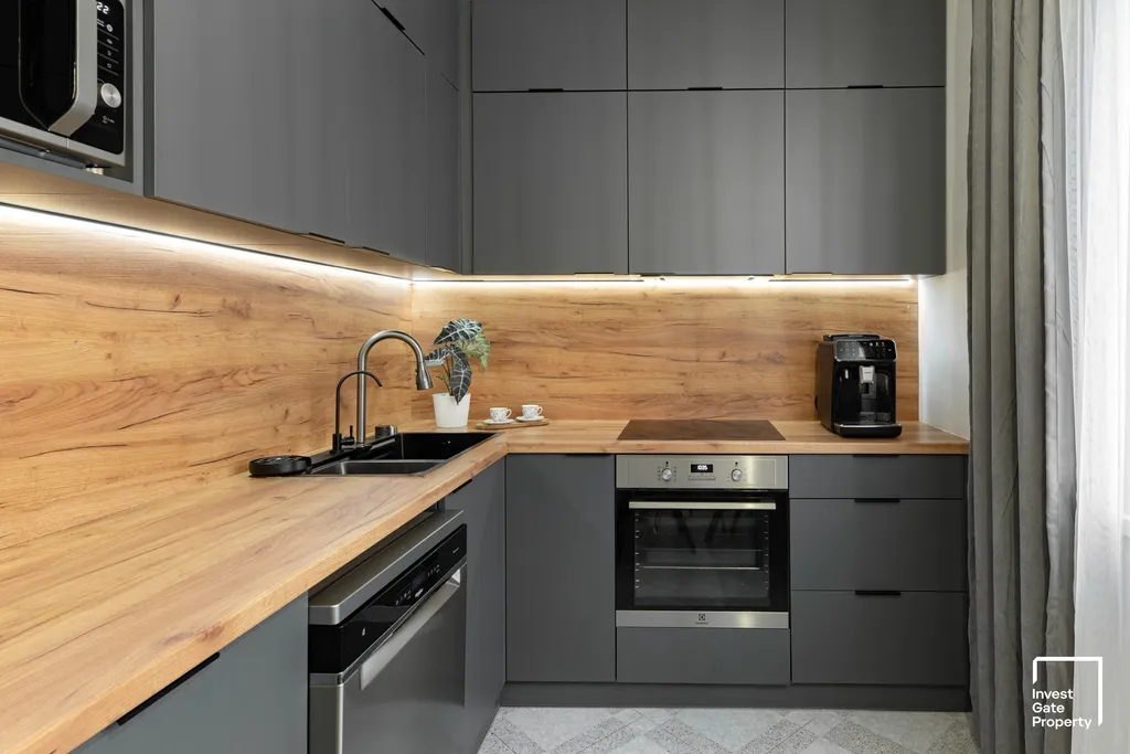 Na jádro plynule navazuje moderní kuchyně s kuchyňskou linkou vyrobenou na míru, včetně vestavěných spotřebičů. Samozřejmostí jsou nové rozvody vody, odpadů i elektřiny, přičemž elektroinstalace je kompletně v mědi a připravena i pro další části bytu.