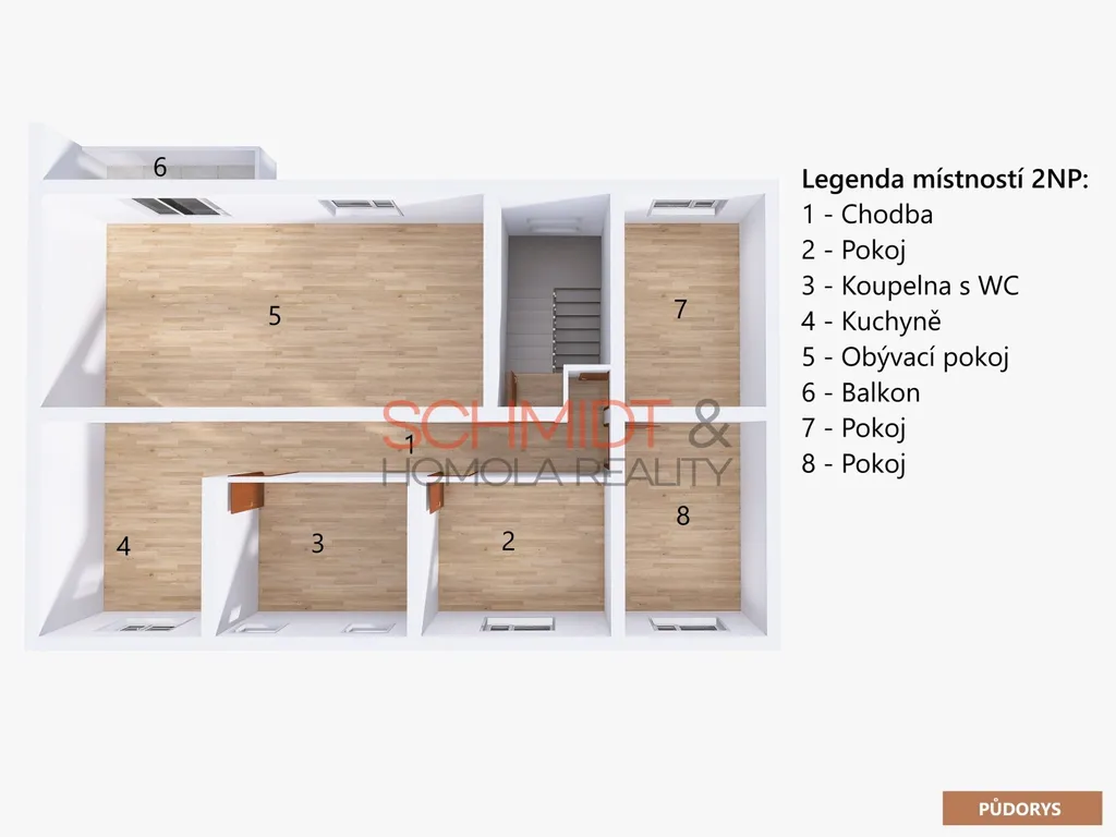 - 2NP má dispozici 4kk. Nabízí tři neprůchozí ložnice a velký obývací pokoj s kuchyňským koutem. V obývacím pokoji je krb s rozvodem tepla do všech místností v patře. I zde je z obývacího pokoje přístup na balkon s výhledem do okrasné zahrady a širšího okolí. V prvním podlaží je dále klimatizace, v koupelně podlahové vytápění.
