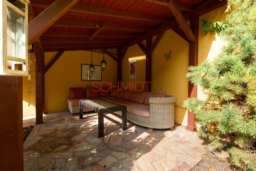 Zásadní proměnou prošla také zahrada. Okrasné části vedle domu dominuje rybník (50.000 litrů vody) s filtrací a kapry Koi, jehož okolí zdobí vzrostlé okrasné keře a rostliny. K posezení v tomto krásném prostředí slouží zastřešený altán. Červeným kvarcitem je provedeno vydláždění pochozích částí okrasné zahrady. Drobná hospodářská stavení slouží k uskladnění zahradního vybavení, případně chovu drobného zvířectva a dřevník k uchování dřeva do krbu. Celá část zahrady je kompletně osvětlená, je zde i rozvod elektřiny.