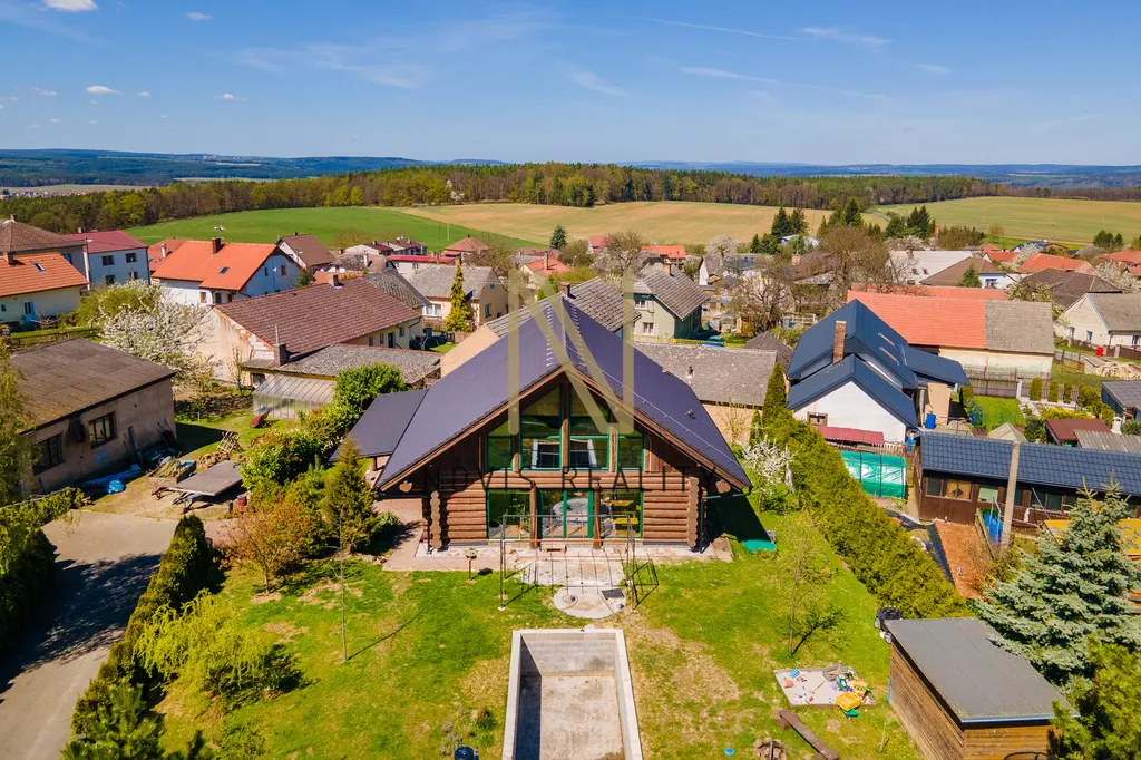 Vytápění a ohřev vody zajišťuje tepelné čerpadlo, v celém domě je podlahové vytápění a díky srubové konstrukci jsou provozní náklady dlouhodobě velmi nízké.