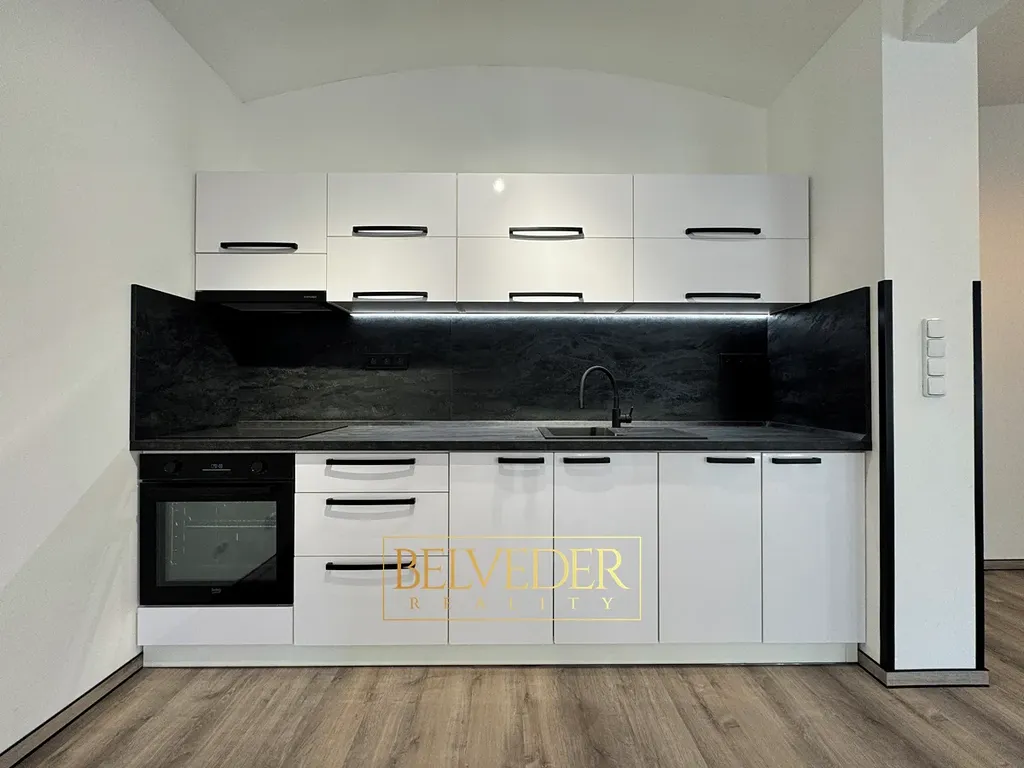 Vybavení: Kuchyňská linka na míru s vestavěnými spotřebiči, částečně zařízený interiér.