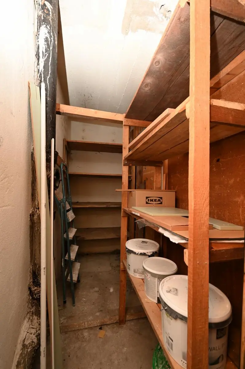 Plně zařízená kuchyň s menším úložným prostorem.