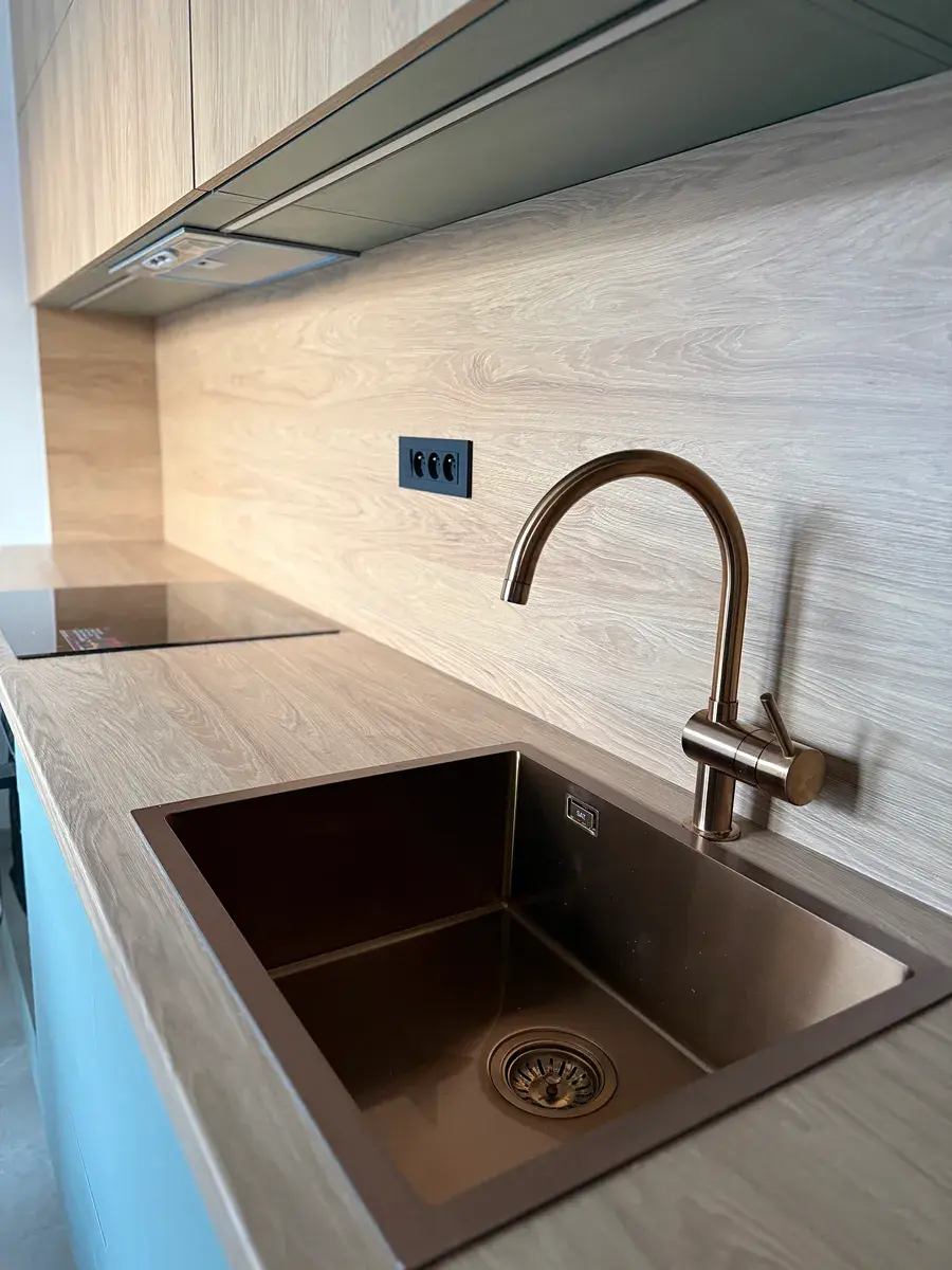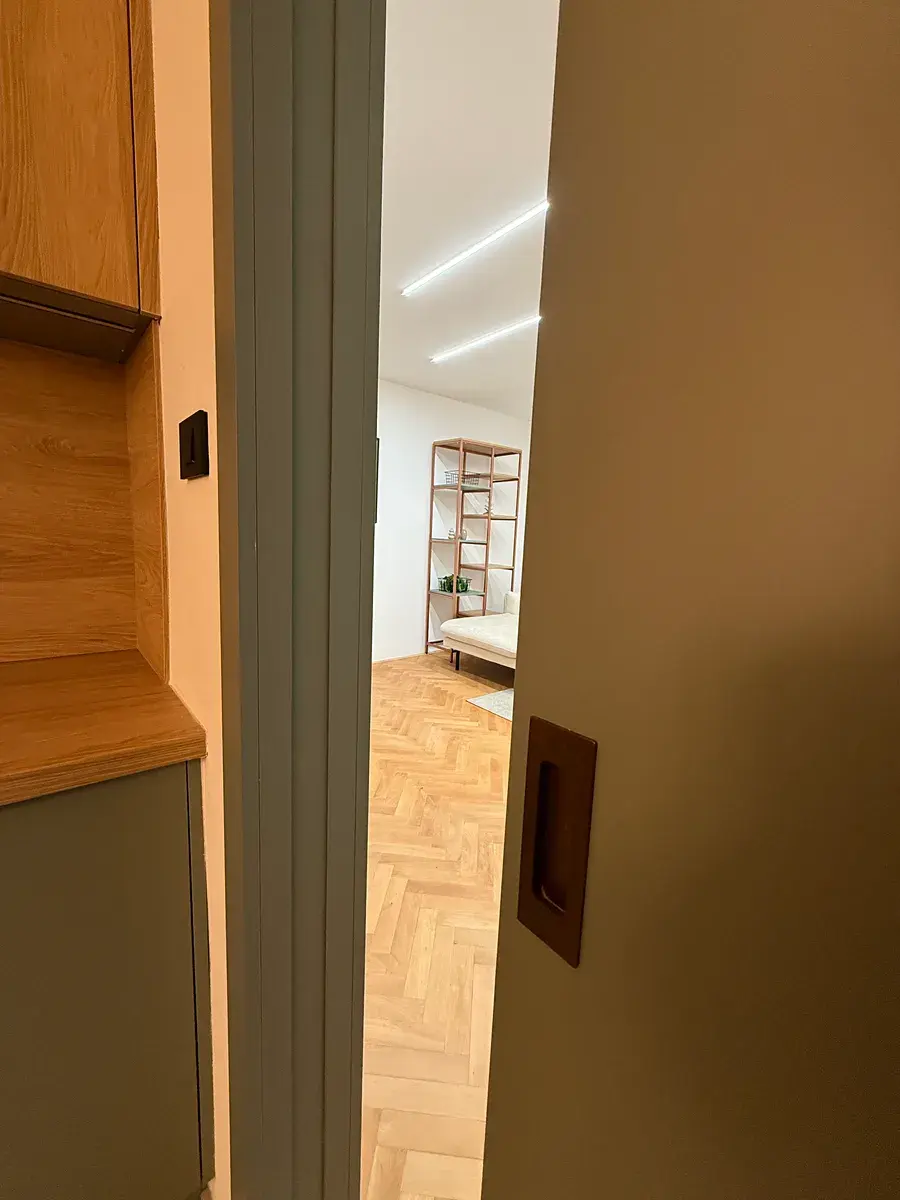 Veškerý nábytek byl vyroben na míru truhlářem, interiérové dveře jsou rovněž zakázkové. Celek působí čistě, jednotně a nadčasově – bez improvizací a levných řešení.
