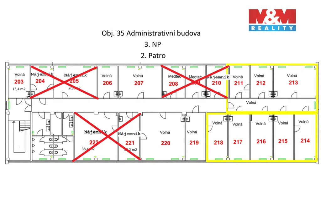 Nabízíme pronájem volných kanceláří v administrativní budově na ul. Brněnská v Hradci Králové. Kancelář na plánku označená jako č. 206 a 207 se nachází ve 3. nadzemním podlaží. V místnosti je umyvadlo. Toalety a kuchyňka jsou společné. Součástí nájmu je i jedno parkovací místo v areálu u budovy. Volné kanceláře jsou jak ve 3. tak i ve 4. nadzemním podlaží. Nájemné činí 2500 Kč/m²/rok + poplatky 1000 Kč/m²/rok. Více informací u makléře.