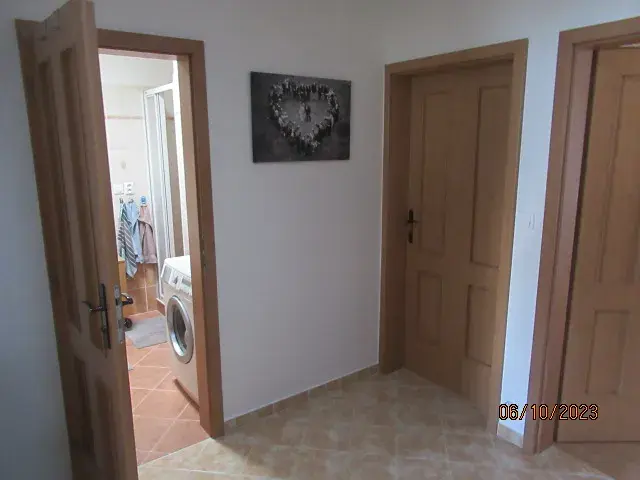 Dispozice bytu dále zahrnuje ložnici a dva samostatné pokoje, ideální jako dětské pokoje, pracovna či pokoj pro hosty. K dispozici je koupelna, samostatná toaleta, vstupní předsíň a samostatná šatna, která výrazně zvyšuje komfort každodenního bydlení. Zkosené stropy v části pokojů dodávají interiéru osobitý charakter a útulnou atmosféru.