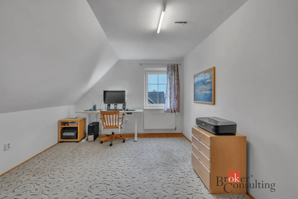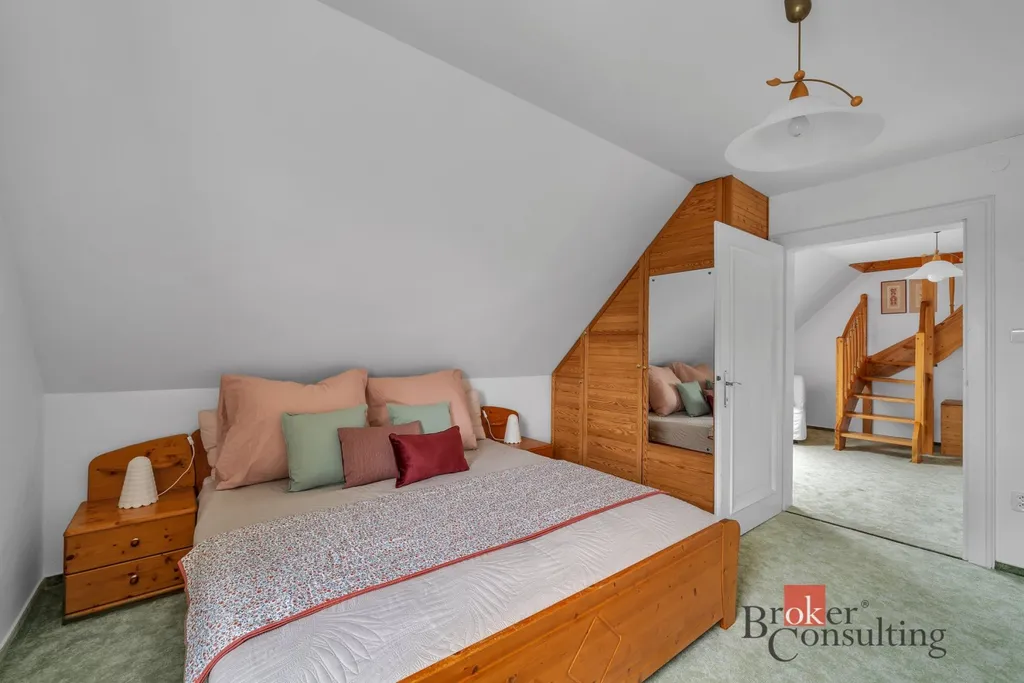 V patře domu se nacházejí dva dětské pokoje, pracovna a koupelna se sprchovým koutem a WC. Z jednoho dětského pokoje je vstup do útulného obytného podkroví.