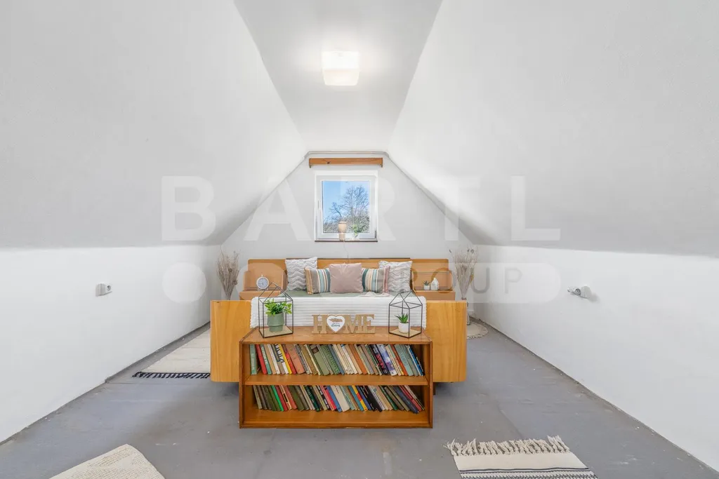 Velkou výhodou nemovitosti je samostatná garáž s dílnou o celkové ploše 37,5 m², která poskytuje dostatek prostoru pro kutily, skladování nebo realizaci menších projektů. Součástí je i hospodářské zázemí a půda, která nabízí další potenciál například pro rozšíření obytné části.