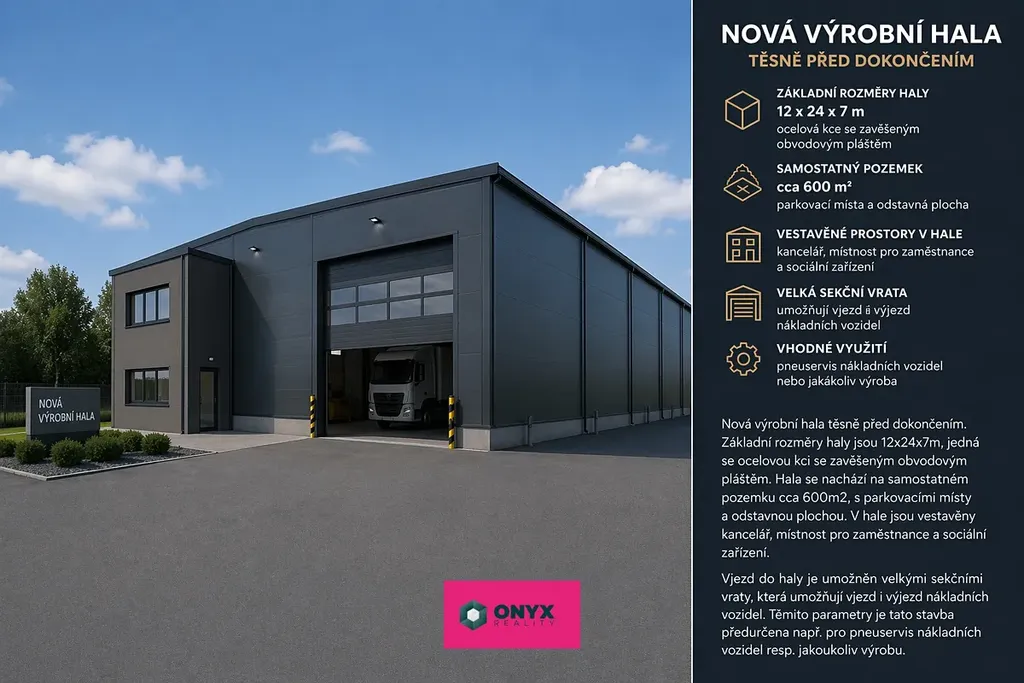 Nová výrobní hala těsně před dokončením. Základní rozměry haly jsou 12x24x7m, jedná se ocelovou kci se zavěšeným obvodovým pláštěm. Hala se nachází na samostatném pozemku cca 600m2, s parkovacími místy a odstavnou plochou. V hale jsou vestavěny kancelář, místnost pro zaměstnance a sociální zařízení.