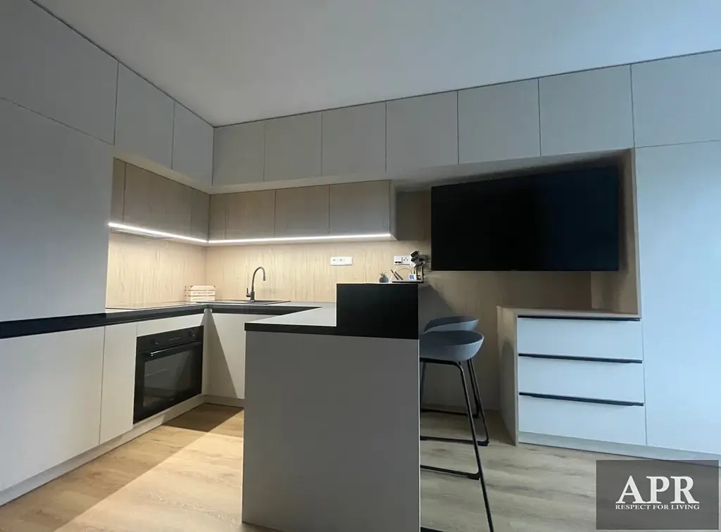 Dispozice: Vstupní chodba s botníkem, prostornou skříní, pračkou a sušičkou. Koupelna se sprchovým koutem, toaletou, osvětleným zrcadlem s úložným prostorem, toaletní skříňkou, umyvadlem a topným žebříkem.Obývací prostor s dvojsedákem, taburetem a konferenčním stolkem. Kuchyňská linka ve tvaru L se vestavnými spotřebiči: indukční varná deska (4 plotýnky), digestoř, elektrická a mikrovlnná trouba, myčka, velká samoodmrazovací lednice s mrazákem. Součástí je barový jídelní stůl se židlemi a TV na otočném držáku. Spací část s manželskou postelí s úložným prostorem a šatní skříní je vkusně oddělena lamelami. Okno je vybaveno venkovními elektrickými žaluziemi a síťkou proti hmyzu. Z pokoje je vstup na balkon s výhledem do zeleně.Interiér je vyroben na zakázku renomovanou truhlářskou firmou.