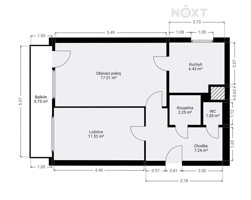 Dispozice je přehledná a funkční: obývací pokoj (17,21 m²) se vstupem na lodžii orientovanou na východ, samostatná ložnice (11,52 m²), kuchyně s oknem orientovaným na jih (6,43 m²), koupelna (2,25 m²), oddělené WC (1,05 m²) a prostorná chodba (7,24 m²). Byt je kompletně vyklizený a připravený na rekonstrukci – původní lina jsou odstraněna, takže můžete rovnou začít tvořit bez zbytečných demoličních prací.