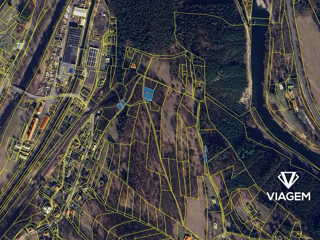 ➡️ Kombinace zeleně, lesního pozemku a komunikace.