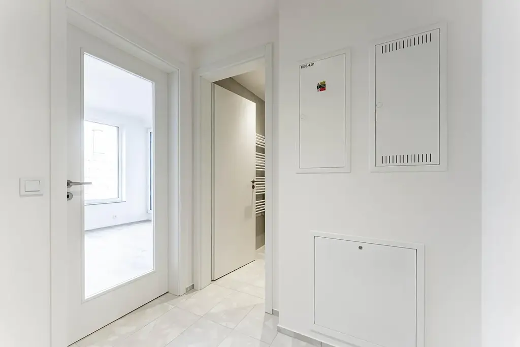 Součástí vybavení je rekuperace, krásné dubové dřevěné podlahy s podlahovým vytápěním, bezpečnostní dveře, předokenní žaluzie, bezfalcové dveře,