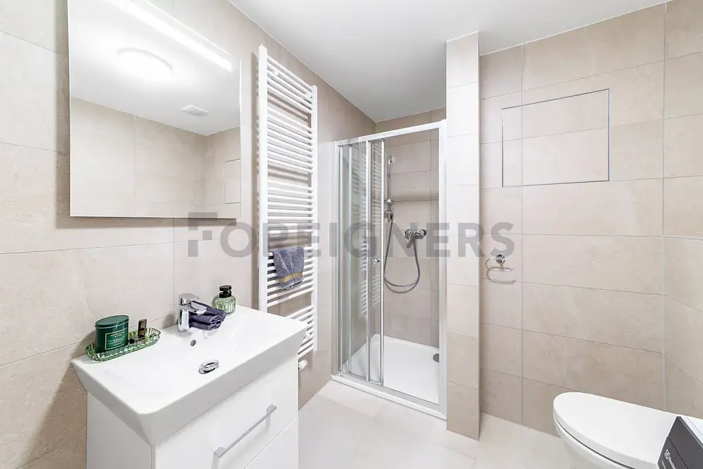 Koupelna s moderním sprchovým koutem, včetně umyvadlové skříňky, s podsvíceným zrcadlem, toaletou a pračkou značky Electrolux.
