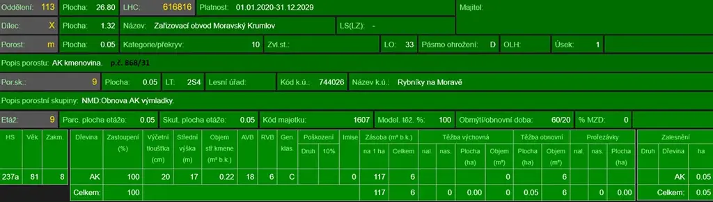 - p.č. 635/8 vedená jako lesní pozemek o celkové výměře 1 742 m2 (stáří 80 lesa let - zastoupení dřevin akát),