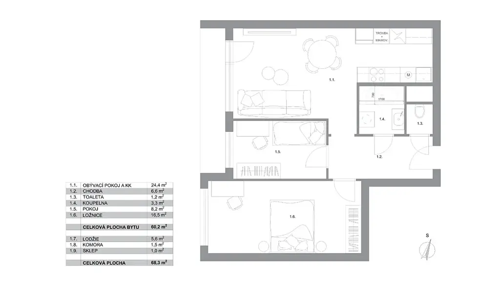 vanou, samostatné WC, dvě ložnice a praktický obývací pokoj s kuchyní vyrobenou na míru. Z obývací části je přímý vstup na prostornou lodžii. Uvedená podlahová plocha v přiloženém půdorysu má pouze orientační charakter.
