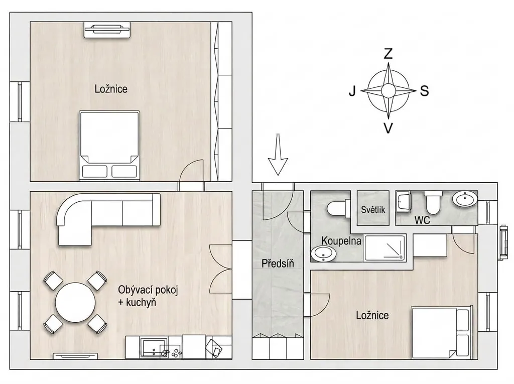 Dispozice je prakticky řešená: prostorná vstupní chodba s úložnými prostory, obývací pokoj s kuchyňským koutem, dvě samostatné ložnice orientované do klidnější části domu, koupelna s WC, další samostatné WC a technická místnost pro pračku a sušičku. Celkem jsou v bytě dvě toalety, což výrazně zvyšuje komfort bydlení.