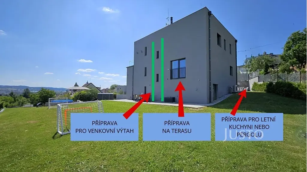 Připravena je i infrastruktura pro budoucí terasu v 2.NP (nerealizovaná) a zahradní pergolu či letní kuchyni připravena je již podlaha-dlažba, kanalizace, voda, elektro - místo je označeno ve fotogalerii.