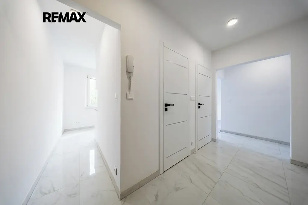 V celém bytě byly použity kvalitní a vkusné materiály. Dlažba v dekoru mramoru sjednocuje koupelnu, chodbu, WC i kuchyň a elegantně ji doplňují černé designové prvky. V pokojích jsou plovoucí podlahy, interiérové dveře s obložkami a bezpečnostní vstupní dveře. v Chodbě je dost místa pro pořízení vestavěných skříní. Samozřejmostí je nová elektroinstalace a prakticky rozmístěné zásuvky. Byt si můžete projít ve virtuální prohlídce.