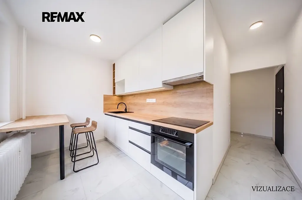Samostatná kuchyně o velikosti 6,5 m² je vybavena novou moderní kuchyňskou linkou s dostatkem úložného prostoru, podsvícením pracovní plochy, myčkou Beko (60 cm), horkovzdušnou troubou a indukční varnou deskou značky Gorenje. Praktickým detailem je flexibilní dřezová baterie. U okna je prostor například pro barový stůl či menší jídelní kout.